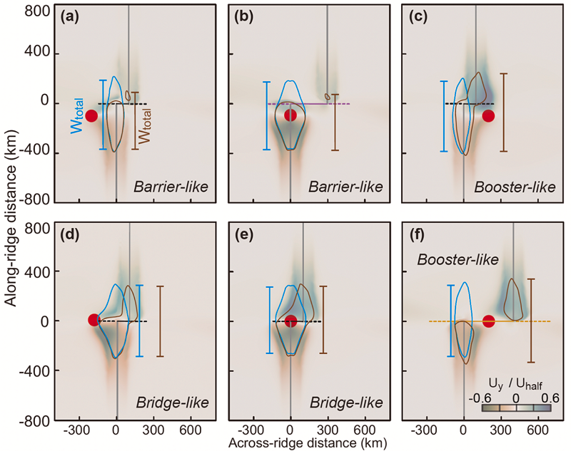 研究发现,转换断层对地幔柱沿脊轴扩散可呈现三种可预测的作用模式,分别是:(1)阻挡模式,即地幔柱位于洋脊外侧或附近存在长偏移(>200 km)转换断层时,下游脊段内地幔柱信号显著减弱;(2)桥梁模式,即地幔柱位于转换断层与洋脊交汇处时,断层成为物质通道,促进地幔柱物质向两侧脊段双向扩散;(3)增强模式,即地幔柱位于洋脊内侧或断层中心下方时,断层的走滑运动强化沿脊地幔流,使地幔柱信号放大传播。