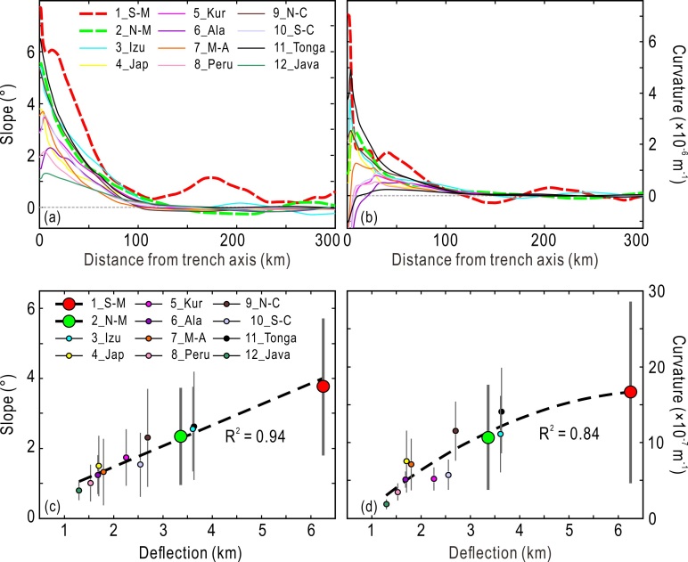 图2 马里亚纳海沟南部与北部,及全球海沟的坡度和曲率对比图。