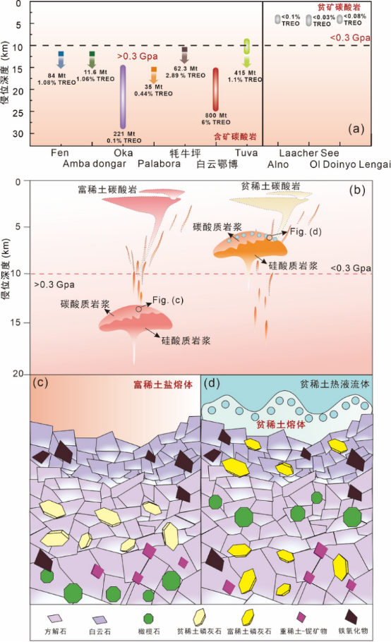 当碳酸质岩浆侵位较深(>0.3 GPa)时:橄榄石最先结晶,大量消耗岩浆中的“硅”,使得后续结晶的磷灰石无法构建“牢笼”,难以容纳和锁死稀土元素。同时,高压环境使岩浆能溶解更多的水,延迟了热液流体的分离,促使体系向富碱和富挥发分的“盐熔体”演化;稀土元素在这类盐熔体中具有较高的溶解度,因此能在残余熔体中持续富集,并结晶出大量过渡性的黄锶碳钠矿等矿物,为晚期氟碳铈矿等经济矿物的大规模沉淀奠定坚实基础。