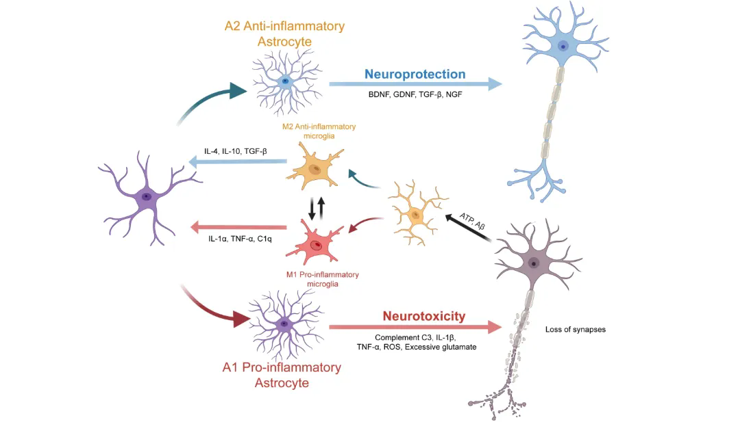 而在疾病状态下,胶质细胞并不是被动响应损伤,而是会发生高度动态的状态转变。小胶质细胞可以从稳态监视状态转向促炎或修复相关状态,星形胶质细胞也可在不同病理背景下转变为具有神经毒性或神经保护性的反应性亚型。正因如此,胶质细胞不再只是疾病“发生之后”的伴随反应者,而更像是决定病程如何推进、损伤如何被放大或限制的关键调度者。