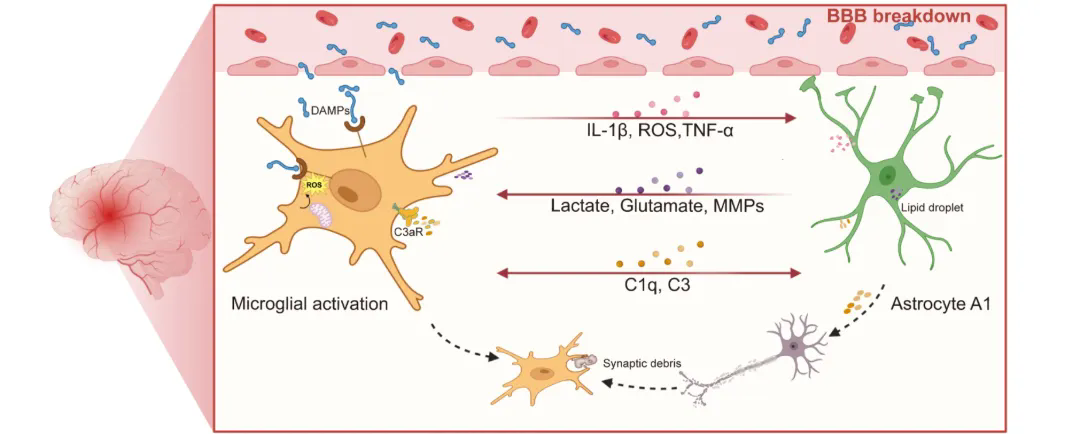 综述系统梳理了小胶质细胞与星形胶质细胞之间的多重反馈环路。活化的小胶质细胞可释放 IL-1α、TNF-α、C1q、ROS 等因子,诱导星形胶质细胞进入更具神经毒性的反应状态;而反应性星形胶质细胞又可通过C3/C3aR轴、代谢产物释放、谷氨酸失衡以及细胞外囊泡等方式,反过来维持或强化小胶质细胞的促炎激活。
