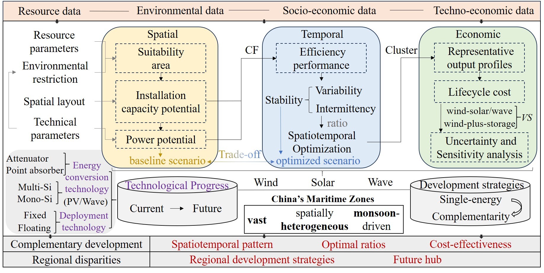 海上风能、太阳能和波浪能具有资源丰富、靠近沿海负荷中心等优势,是未来沿海地区绿色低碳转型的重要方向。然而,现有研究多侧重于资源潜力或单一互补类型分析,缺乏将空间适宜性、时间稳定性和技术经济性统一纳入同一框架进行综合评估。针对这一问题,蔡国田团队构建了栅格尺度的海上风—光—波互补时空技术经济评估框架,以中国海域为对象,系统评估了不同互补组合的开发潜力、稳定性和经济可行性,为海上多能互补开发提供了新的分析框架和决策依据(图1)。