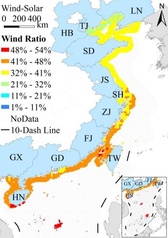 在稳定性方面,研究发现三种能源的时间输出特征差异明显。风光互补可较风电单独开发降低15%的波动幅度、63%的波动速率和70%的间歇性;风波互补则在降低波动速率和间歇性方面更为突出,分别可降低88%和91%,但会带来一定波动幅度上升。对应的最优风电占比在空间上表现出明显差异:风光互补中风电占比总体在32%-48%之间,南部海域更高;风波互补中风电占比整体更低,并呈现由近岸向远海增加的趋势(图3)。