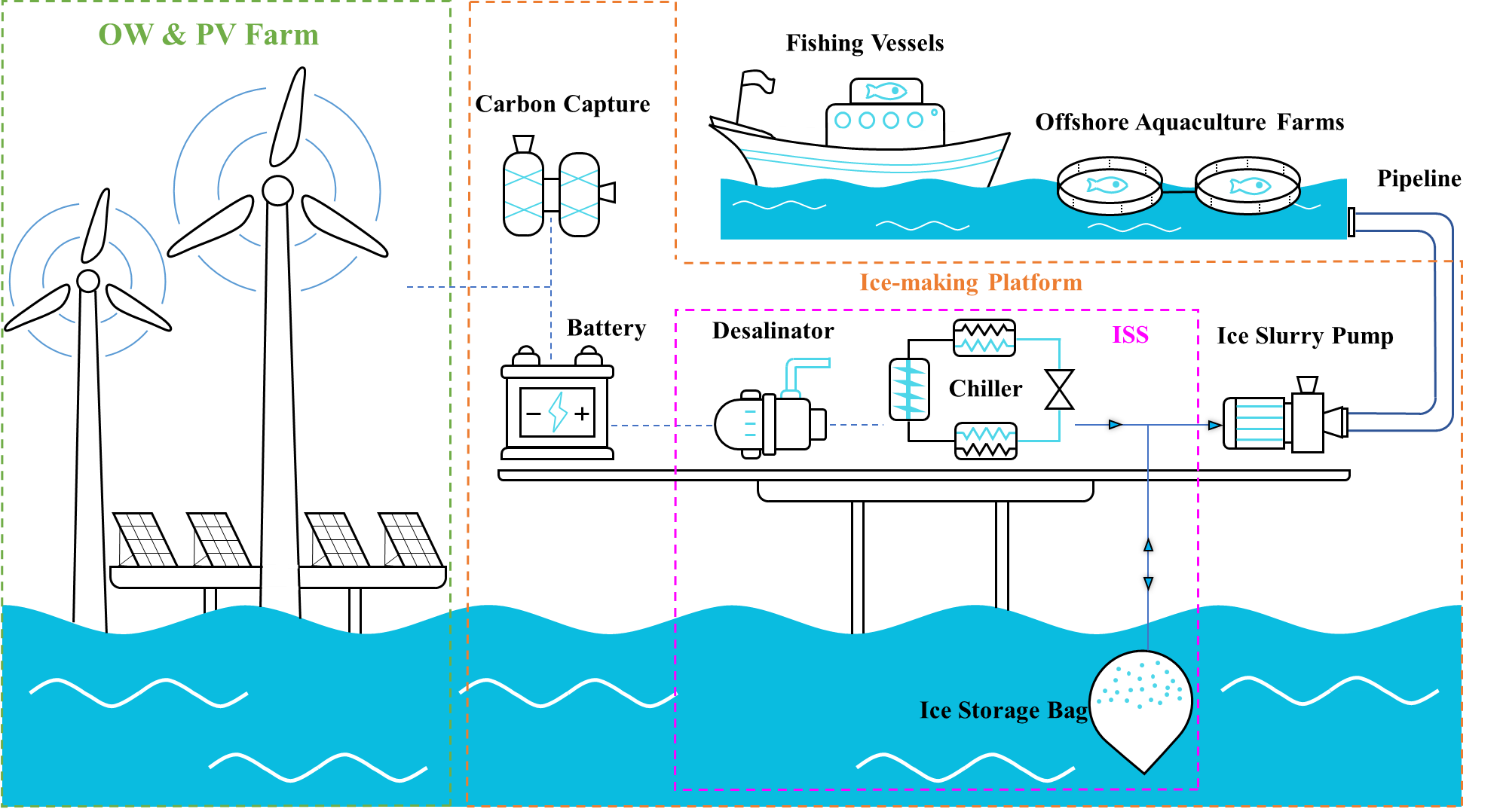 研究团队设计了一套集海水冰浆、电池储能与碳捕集于一体的P2I系统,直接将海上风电与光伏的绿色电能,就地利用海水转化为可泵送、可储存的流态化冰浆,以冷能形式存储在作业平台或水下柔性囊式冰袋中,服务于海上渔业冷链物流。