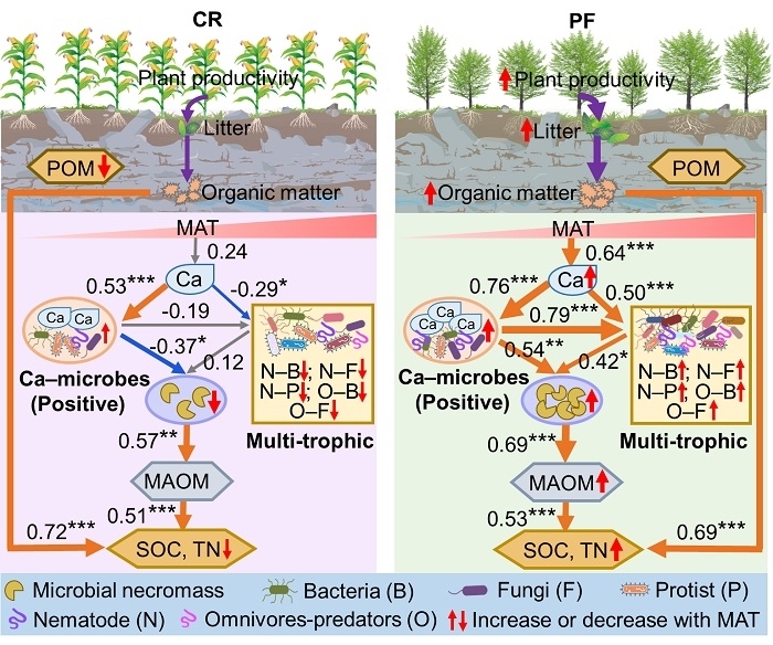 结果表明:(1)与碎屑岩相比,石灰岩土壤较高的pH和交换性钙显著提高固氮菌和解磷菌丰度,增强了固氮菌、解磷菌和丛枝菌根真菌协作关系及网络稳定性,提升了土壤固氮速率。在磷有效性受限的喀斯特土壤中,解磷菌通过与固氮菌和丛枝菌根真菌的紧密互作构建复杂稳定的微生物网络,是促进土壤固氮的关键机制,强调岩性通过调控关键功能微生物类群及其互作网络促进土壤氮输入;(2)在碳氮积累方面,人工林的矿物结合有机碳、总有机碳和总氮均显著高于耕地,且碳氮耦合更为紧密。升温促进人工林中碳氮储量的增加,而耕地有机碳则随温度升高而下降;(3)这一差异主要与人工林更高的交换性钙水平、微生物残体碳氮积累以及更强的钙-微生物和跨营养级互作密切相关。富钙土壤提升土壤碳氮累积的作用机制主要体现在两个方面:其一,高钙环境通过促进微生物生长与代谢,提高微生物残体的形成与稳定,凸显钙-微生物互作在碳氮累积调控中的重要作用;其二,钙通过强化微生物之间及跨营养级生物的协同作用,构建更紧密稳定的微生态网络,从而在气候变暖背景下促进土壤碳氮的协同积累。