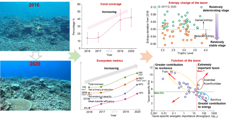 研究团队以南海典型珊瑚礁生态系统为对象。该区域在遭受极端气候事件严重干扰以后,于2016-2020年期间显现出自然恢复趋势,为研究珊瑚礁恢复过程中生态结构与功能的协同机制提供了难得的理想场景。本研究基于调查数据构建生态网络模型,从生态系统水平和类群水平定量解析能量流动格局及其时空变化,探讨能量分配、生态冗余性与系统恢复力之间的内在关联。