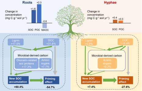 中国科学院华南植物园恢复生态学团队联合美国、澳大利亚和西班牙等多国科研机构,在热带森林土壤碳汇机制研究中取得重要进展。研究团队选取热带地区同一演替序列下的典型森林类型(包括马尾松林、针阔混交林和季风常绿阔叶林),开展了为期两年的野外原位培养实验。通过结合内生长袋与同位素示踪技术,并调控内生长袋网孔尺寸,实现了对根系与外延菌丝在土壤碳输入中相对贡献的精确区分与量化。研究结果表明,根系对土壤有机碳的年均净贡献为1.2 mg C g⁻¹土壤,是外延菌丝(0.32 mg C g⁻¹土壤)的近4倍。根系不仅显著促进新碳的固定,还可抑制原有有机碳的分解,从而实现土壤碳的净积累。此外,根系输入主要促进颗粒有机碳(POC)的积累。研究还发现,不同演替阶段的热带森林其碳输入策略存在明显差异:演替早期以丛枝菌根植物为主,依靠快速周转的根系大量输入碳;中期转为以外生菌根真菌为主,菌丝寿命更长、碳输入更稳定;至演替晚期,则形成功能互补的稳定碳汇机制。该研究系统阐明了根系与菌丝在热带森林土壤碳汇中的相对作用,凸显了根系性状在碳固存中的核心地位。研究人员建议,在热带森林恢复与管理中,应优先选用具备高效碳输入能力的树种,并结合菌根共生策略,以提升土壤碳汇功能。该成果深化了对热带森林碳循环机制的理解,也为全球热带地区的生态恢复提供了科学依据。该研究首次系统揭示了植物根系在土壤有机碳积累中的主导作用,其贡献约为外延菌丝的4倍。相关研究成果已近日发表在国际生态学权威期刊Global Change Biology上,为热带森林碳汇管理提供了新视角。论文共同第一作者为中国科学院华南植物园鹤山站博士生陈晓琳与博士后牟之建,刘占锋研究员与王俊研究员为共同通讯作者。研究获得了广东省基础与应用基础研究旗舰项目和国家自然科学基金等资助。论文链接:https://doi.org/10.1111/gcb.70499图. 根系与外延菌丝影响土壤有机碳动态及净变化的概念图。描述了新SOC形成、原有SOC激发效应及其与SOC组分(如木质素、DOC和微生物来源碳)之间的关系。绿色箭头表示正向效应,灰色箭头表示负向效应。变化速率指有无根系或菌丝处理间浓度的相对差异。POC:颗粒有机碳;MAOC:矿物结合有机碳。
