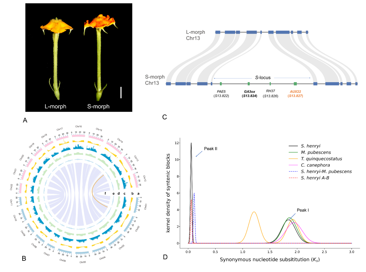 花部形态的多样性在被子植物进化中扮演着核心角色,也是物种分化的重要推动力量。异型花柱(Heterostyly)是一种由S位点超基因(S-locus supergene)控制的花型多态现象,早在19世纪就已受到达尔文等学者的广泛关注。异型花柱是指同一物种的群体中存在两种(二型花柱)或三种(三型花柱)雌雄蕊高度互补的个体,这种花部结构具有提高植物传粉精确度、降低雌雄干扰、促进异花传粉等重要生态功能。达尔文曾将其形象地称为“A most complex marriage arrangement” (Darwin 1864,Journal of the Proceedings of the Linnean Society)。全基因组复制(Whole Genome Duplication,WGD)或多倍化(polyploidization)是生物体的全部遗传信息发生一次或多次复制的过程,对被子植物繁育系统和形态演化具有重要影响。经典观点认为,多倍化常导致异型花柱向同型花柱转变,即“基因组加倍引发异型花柱的瓦解”。然而,以往对异型花柱分子调控机制的研究都局限于二倍体,对于多倍体植物异型花柱的发生和演化还存在诸多未解之谜。该研究首次完成了茜草科四倍体二型花柱植物——裂果金花(Schizomussaenda henryi)的染色体水平基因组组装与解析,揭示了其控制花柱异长的S位点超基因在多倍化后仍保持完整功能。基于全基因组测序、比较转录组、形态学、繁殖生物学等多种手段,获得了裂果金花高质量的染色体水平基因组,并鉴定到二型花柱相关的S-locus超基因只存在于短柱花型的个体,呈半合子(hemizygosity)结构;由包含SchzAUX22在内的四个紧密连锁的基因构成。其中,SchzAUX22 是重要的生长素响应因子,被鉴定为调控二型花柱发育的关键候选基因。系统学和k-mer分析表明,裂果金花的基因组可能起源于约360万年之前的异源多倍化事件。通过计算S-locus基因和其同源基因的同义替换率(Ks),发现S-locus的起源时间(约5000万年前)远早于裂果金花多倍化的发生时间。这些证据表明,尽管裂果金花存在由杂交导致的异源多倍化,S位点仍能保持完整并发挥功能;多倍化并不必然导致异型花柱的瓦解。这是首次从全基因组层面破译多倍体植物异型花柱的分子机制。该成果为深入理解被子植物花部多态性及繁育系统的进化提供了新的视角。在达尔文发表《同种植物的不同花型》(The different forms of flowers on plants of the same species)148年后,人类对植物交配机制的理解再次迎来突破。中国科学院华南植物园研究团队与山东理工大学罗中莱教授、加拿大多伦多大学著名进化生物学家Spencer C.H. Barrett教授等科研人员的合作研究成果,以“Genetic architecture of the S-locus supergene revealed in a tetraploid distylous species”为题近日发表在植物科学领域权威期刊New Phytologist(《新植物学家》)(生物学一区TOP,IF5year=10.3)上。中国科学院华南植物园张奠湘研究员、石苗苗助理研究员及山东理工大学罗中莱教授为共同通讯作者,罗中莱教授为第一作者,华南植物园为第一完成单位。研究得到了国家自然科学基金面上项目、广东省自然资源事务专项资金等资助。文章链接:https://nph.onlinelibrary.wiley.com/doi/10.1111/nph.70521图. A. 裂果金花(Schizomussaenda henryi)长柱型花(L-morph)与短柱型花(S-morph);B. 短柱型基因组Circos图;C. 半合子位点基因结构示意图;D. 裂果金花与近缘物种旁系同源基因的Ks分布分析。