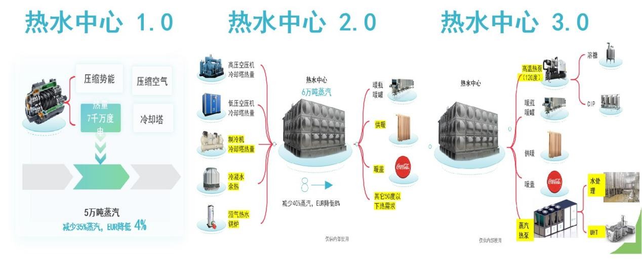 中国科学院广州能源研究所地热能与节能技术研究中心基于自研的大温差冷热双供热泵、超高温直接蒸发式蒸汽热泵、高效蓄冷蓄热等核心技术及装备,构建了一种以绿色电力作为驱动能源的冷热汽耦合供能系统,可以同时供应 4-20℃冷水、50-95℃热水和 100-170℃饱和蒸汽,满足零碳工业园区的生产制造能源需求。建设零碳园区是我国锚定碳中和目标的重大战略举措。《关于开展零碳园区建设的通知》中强调,“积极稳妥推进碳达峰碳中和,加快经济社会发展全面绿色转型,支持有条件的地区率先建成一批零碳园区。”传统工业供能系统的冷能和热能相互独立。其中工业供蒸汽和供热主要依靠蒸汽管网加热,其热量来自于天然气、煤炭等化石能源,碳排放系数大,蒸汽管网自身的散热损失大,直接用于加热热水时的㶲损大;工业供冷主要依靠蒸汽压缩循环的电制冷,需要消耗电力获取工艺所需的冷量,过程中必须通过冷却塔向环境排放低品位废热。针对以上问题,中国科学院广州能源研究所地热能与节能技术研究中心基于自研的大温差冷热双供热泵、超高温直接蒸发式蒸汽热泵、高效蓄冷蓄热等核心技术及装备,构建了一种以绿色电力作为驱动能源的冷热汽耦合供能系统(如下图1所示),可以同时供应4℃~20℃冷水、50℃~95℃热水和100℃~170℃饱和蒸汽,满足零碳工业园区的生产制造能源需求。该系统实施路径分3个阶段。第一阶段,回收工业高温余热,例如二次乏蒸汽、冷凝水、空压机余热等,采用直接换热的方式,提高能源的利用效率;第二阶段,采用高温工业热泵将低品位的余热提升至高温热水,或采用大温差冷热双供热泵同时供应工艺冷水和高温热水;第三阶段,采用超高温蒸汽热泵,利用制备的高温热泵,供应100℃~170℃蒸汽,最终形成电力驱动的冷能、热能、蒸汽的耦合供能系统。科研团队针对啤酒加工、工业饮料等行业逐步构建冷热汽耦合供能系统的典型案例,相关项目成果和示范应用已在部分企业落地。图1 基于热泵+的冷热汽电耦合供能系统“三步走”路线图研究中心具有一系列高效节能技术及装备产出,先后研制出动态冰浆制备机组(2006年),建成了潜热输送示范工程(2008年)、国产化燃气热泵机组(2020年),研制了国内170℃蒸汽热泵机组(2023年),搭建了覆盖0℃~20℃供冷、50℃~95℃供热、100℃~170℃供蒸汽的工业热泵系列装备,为构建吨级绿色电能驱动的冷热汽电耦合供能系统提供了热泵核心装备及系统解决方案,致力于支撑国家零碳园区战略的实施。图2 中国科学院广州能源研究所先进热泵产品图谱