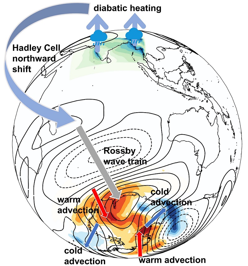 近日,中国科学院南海海洋研究所热带海洋环境实验室(LTO)与全球海洋和气候研究中心(GOCRC)王春在研究员团队在一区TOP期刊 npj Climate and Atmospheric Science 发表最新成果,揭示了印度夏季风降水如何通过跨半球机制影响南极气候和海冰分布。论文由LTO博士研究生宋强华担任第一作者,研究员王春在为通讯作者,合作作者还包括LTO研究员张磊和中山大学副教授范汉杰。近年来,南极及周边海域的气候变化愈加显著,不仅影响极地生态,还对全球大气和海洋环流系统产生深远影响。明确南极气候的关键驱动因素,对于预测未来极地及全球气候变化趋势、评估海平面上升风险具有重要意义。以往研究多聚焦于海洋多尺度变率对南极气候的作用,而本研究首次提出印度夏季风降水也能通过大气过程跨越半球,调控南极地表气温和海冰分布(图1)。研究表明,印度夏季风降雨释放潜热,使得印度洋区域的哈德莱环流整体北移。这一变化在南印度洋马斯克林群岛附近激发出大气罗斯贝波列,并沿南印度洋传播至南极。罗斯贝波的传递改变了南极的海平面气压格局,进而在东西南极沿岸形成风场:近岸风导致南极大陆大范围升温,而离岸风触发的冷平流则影响罗斯海和威德尔海。冷暖空气的输送使南极地表温度发生变化,海冰分布呈现出类似“三极子”的模态特征。该研究不仅揭示了印度夏季风降水与南极气候和海冰之间的物理联系,还为提升南极海冰的季节预测能力、完善气候动力学理论框架提供了新的科学依据,同时深化了人们对热带–极地遥相关及其气候效应的理解。本研究得到了国家自然基金委合作创新研究团队项目、国家自然科学基金重大项目等共同资助。相关论文信息:Song,Q.,Wang,C.,Zhang,L.,Fan,H. Indian summer monsoon rainfall drives Antarctic climate and sea ice variability through atmospheric teleconnections. npj Clim Atmos Sci 8,320 (2025).文章链接:https://doi.org/10.1038/s41612-025-01213-7图 1 印度夏季风降水对南极气候影响的示意图。印度夏季风降水释放的非绝热加热导致哈德莱环流向北移动,从而激发罗斯贝波列(等值线)从南印度洋马斯克林群岛向南极传播。该罗斯贝波列改变了海平面气压,为东南极大陆和西南极大陆带来暖平流(南极区域红色箭头),同时在罗斯海和威德尔海区域则形成明显的冷平流输送(南极区域蓝色箭头)。