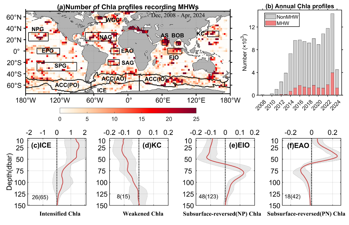 近日,中国科学院南海海洋研究所热带海洋环境实验室(LTO)陈更新团队利用长达17年的全球 Biogeochemical-Argo(BGC-Argo)浮标观测数据,深入剖析了海洋热浪对全球浮游植物垂直分布结构的影响。近日,该研究成果以LTO博士研究生马雪莹为论文第一作者,陈更新研究员为通讯作者,发表在国际期刊Communications Earth & Environment上。近日,中国科学院南海海洋研究所热带海洋环境实验室(LTO)陈更新团队利用长达17年的全球 Biogeochemical-Argo(BGC-Argo)浮标观测数据,深入剖析了海洋热浪对全球浮游植物垂直分布结构的影响。近日,该研究成果以LTO博士研究生马雪莹为论文第一作者,陈更新研究员为通讯作者,发表在国际期刊Communications Earth & Environment上。随着全球变暖的持续加剧,过去几十年来,海洋热浪的发生频率显著上升,持续时间也不断延长,给海洋生态系统带来了严重威胁。浮游植物作为海洋的初级生产者,支撑着整个海洋食物网,并在全球碳循环中发挥着关键作用,主要分布于海洋上层200米以内的水体。然而,既有研究多集中于浮游植物在近表层对海洋热浪的响应,难以反映其在水体内部的垂直结构变化。因此,关于海洋热浪如何影响浮游植物垂直分布的机制,我们仍缺乏系统性的理解。本研究结合BGC-Argo浮标的生物地球化学及物理参数的垂直剖面数据,首次在全球尺度上识别并总结了浮游植物对海洋热浪的四种典型垂向响应类型(图1)。这些垂直响应类型在时间和空间尺度上均表现出显著差异,具体可分为以下四类:(1)增强型:上层水体叶绿素 a 浓度显著上升,主要分布于高纬度海域;(2)减弱型:上层水体叶绿素 a 浓度明显下降,主要出现在热带与副热带海域;(3)次表层反转型-NP:表层叶绿素 a 浓度下降,次表层浓度升高,在赤道印度洋尤为显著;(4)次表层反转型-PN:表层浓度升高,次表层浓度降低,在赤道大西洋最为常见(图2)。进一步研究表明,海洋热浪的发生显著促进了次表层叶绿素最大值层(Deep Chlorophyll Maximum,DCM)的形成与发展,显著影响了其深度位置与强度变化。通过对典型极端海洋热浪事件的深入分析,研究进一步揭示了海洋热浪的垂向结构通过改变不同深度的光照、温度与营养盐环境,进而影响浮游植物的垂直分布格局与空间重分布过程。本研究首次在全球尺度上提供了海洋热浪期间全球浮游植物垂直分布结构变化的直接观测证据,识别出四种主要的垂直响应结构,丰富了我们对浮游植物应对海洋极端气候事件行为的认知,为未来海洋生态系统响应气候变化的预测提供了观测基础与理论支持。本研究得到了国家自然科学基金、广东省基础与应用基础研究基金和中国科学院南海海洋研究所基金的共同资助。相关论文信息:Ma,X.,& Chen,G. (2025). Marine heatwaves are shaping the vertical structure of phytoplankton in the global ocean. Communications Earth & Environment,6(1),715.文章链接:https://www.nature.com/articles/s43247-025-02718-y图1 海洋热浪期间叶绿素 a(Chla)剖面的时空分布a:记录海洋热浪(MHWs)事件的叶绿素 a 剖面在全球的空间分布。b:海洋热浪期间(红色柱状)与非海洋热浪期间(灰色柱状)每年的叶绿素 a 剖面数量。c–f:海洋热浪期间四种垂直叶绿素异常类型的典型案例(红色实线,单位:mg m⁻³):c:在季节性冰区的增强型叶绿素异常;d:黑潮区域的减弱型叶绿素异常;e:赤道印度洋的次表层反转型-NP;f:赤道大西洋的次表层反转型-PN。c–f 中的灰色阴影表示标准差。c–f数字表示在海洋热浪期间识别出的对应垂直异常类型的叶绿素剖面数量,括号内的数字表示海洋热浪期间的叶绿素剖面总数。图2 海洋热浪(MHWs)期间垂直叶绿素 a 异常的时空分布a:海洋热浪(MHW)期间(红线)与非 MHW 期间(黑线)叶绿素 a 剖面数量的纬向分布。b:全球海洋中叶绿素 a 浓度异常的纬向分布。c:基于 BGC-Argo 观测,15 个区域内海洋热浪期间不同类型垂直叶绿素 a 异常的比例分布。绿色表示减弱型(Weakened)、黄色表示增强型(Intensified)蓝色和粉色分别表示两类次表层反转型(NP 和 PN)。d:海洋热浪期间各月主导的垂直叶绿素 a 异常类型(填色),以及各类型在当月 MHW 剖面中的占比(青色线条)。<!--!doctype-->