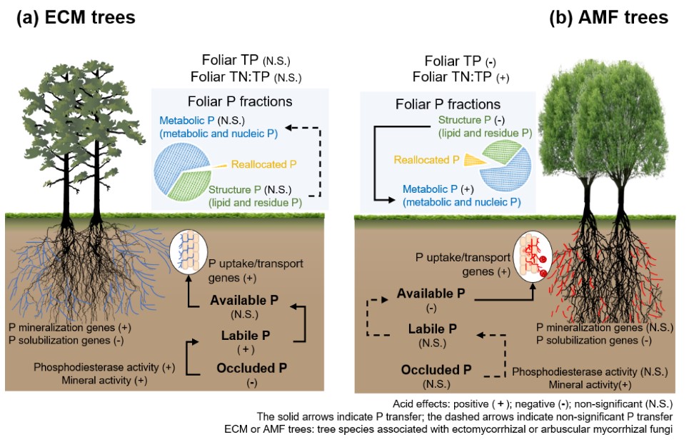 酸雨是全球重要的环境问题之一,尤其是我国南方,近年来持续的酸雨导致该区域部分森林土壤急剧酸化,养分和盐基离子逐渐耗竭,将威胁其生态系统结构和服务功能。华南植物园邓琦课题组在先前的研究中发现,长期酸雨导致的土壤酸化将加速铁、铝氧化物的活化及其对磷的吸附,从而降低土壤磷有效性(Hu et al.,2023, Science of the Total Environment)。尽管研究发现,植物能够通过调动菌根真菌促进有机磷矿化,从而缓解酸化导致的磷限制(Hu et al.,2022, Global Change Biology),但在酸雨加剧的背景下,我国南方常绿阔叶林树种的响应及其机制仍不明确。中国科学院华南植物园博士后胡苑柳等科研人员,研究基于鼎湖山季风常绿阔叶林长期模拟野外酸沉降实验,进一步探究林内与丛枝菌根或外生菌根共生的主要树种对酸雨加剧导致的磷限制的适应及机制。研究发现:(1)酸雨处理并未改变外生菌根树种根际土壤有效磷含量,反而导致不稳定磷的显著增加以及闭蓄态磷的下降,这些变化与根际土壤磷酸二酯酶活性及其编码基因相对丰度的增加相关。(2)酸雨处理显著降低丛枝菌根树种根际土壤有效磷及其叶片磷含量,但同时该树种在叶片磷组分中表现出更大的可塑性,即结构态磷组分显著下降而代谢态磷组分增加。这些结果表明,为应对长期酸雨引起的磷限制,外生菌根树种可能倾向于增强磷活化的营养策略,而丛枝菌根树种则更倾向于采取提高叶面磷利用率的保守策略。研究成果以“Tropical tree-mycorrhizal types show divergent phosphorus adaptive strategies after 12-year simulated acid rain”为题近日在线发表在国际学术期刊Soil Biology and Biochemistry(《土壤生物学与生物化学》)(IF=10.2)上。中国科学院华南植物园鼎湖山站博士后胡苑柳为论文第一作者,邓琦研究员为通讯作者。文章链接:https://doi.org/10.1016/j.soilbio.2025.109968图. 两种菌根树种在长期酸雨引起的磷限制下的不同适应策略