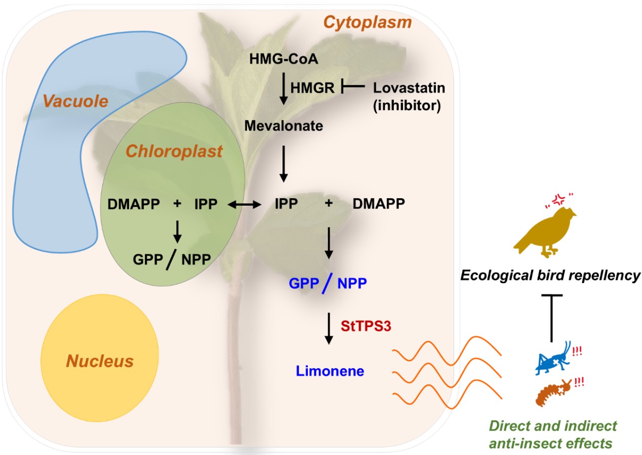以往研究表明,在机场场道及附近种植南美蟛蜞菊(Sphagneticola trilobata (L.) Pruski)能够有效降低昆虫密度、减少鸟类数量,从而降低航空鸟击事件风险。然而,南美蟛蜞菊的驱虫机制、抗虫活性物质的具体组成及其合成途径尚不明确。因此,系统解析南美蟛蜞菊中具有驱虫作用的化感物质及其生物合成机制,对开发针对性的绿色鸟击防控技术具有重要意义。中国科学院华南植物园农业与生物技术研究中心曾兰亭等科研人员综合运用多种实验方法,系统鉴定了南美蟛蜞菊的关键抗虫单萜化合物,并阐明了其生物合成机制。研究发现,柠檬烯、α-水芹烯和对伞花烃是南美蟛蜞菊的主要挥发性单萜,占总量的80%以上,且具有显著的抗虫功能(用于抗虫评价实验的昆虫为鸟类主要食物来源)。体外酶活实验证实,细胞质定位的StTPS3具有广谱的底物选择性,能够同时利用香叶基焦磷酸(GPP)和橙花基焦磷酸(NPP)催化生成柠檬烯。代谢抑制实验进一步表明,甲羟戊酸(MVA)途径的抑制会显著降低单萜物质的释放,提示在细胞质中可能存在单萜合成途径(图1)。该研究首次从挥发性抗虫物质的角度揭示了南美蟛蜞菊在机场驱鸟及绿化管理中的应用潜力,为基于植物化感作用的鸟击防控策略提供了科学依据。相关研究成果以题为“Inhibitor treatment and subcellular localization analysis reveal the contribution of a cytosolic terpene synthase to the substantial release of anti-insect monoterpenes by Sphagneticola trilobata (L.) Pruski” 在线发表在国际学术期刊Journal of Advanced Research(《前沿研究杂志》)上。中国科学院华南植物园王淼博士研究生、公共实验室贾永霞正高级工程师为论文共同第一作者,曾兰亭研究员和简曙光研究员为论文共同通讯作者。本研究得到国家重点研发计划等项目资助。论文链接:https://doi.org/10.1016/j.jare.2025.01.047图1. 南美蟛蜞菊主要抗虫单萜物质的生物合成机制