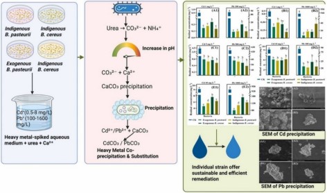 随着工业化和农业活动的持续扩张,重金属镉和铅对水体和土壤的污染已演变为一项严峻的全球性环境挑战。这些有毒金属不仅具有环境持久性和高生物毒性,更易通过食物链富集,严重威胁生态系统稳定与农产品安全。在众多绿色、可持续的原位生物修复技术中,微生物诱导碳酸盐沉淀技术(MICP)因其环境友好、成本相对较低且能实现长效稳定等优势而备受关注。由于实际污染场地中镉、铅等重金属往往同时存在,它们之间可能产生协同、拮抗或竞争抑制等复杂的交互作用,这些相互作用会深刻影响微生物的活性、矿化效率以及最终修复效果的稳定性。若忽视这一复杂情境,仅基于单一污染体系优化的技术在实际应用中难免会“水土不服”。因此,深入探索MICP技术在镉-铅复合污染条件下的作用效率与微观机制,对于精准治理复杂污染场地具有至关重要的现实意义。该研究从粤北典型污染土壤中成功筛选出两种本地矿化细菌——巴氏芽孢杆菌和蜡样芽孢杆菌,并与商业菌株进行了系统性对比。研究结果表明,在低浓度污染条件下(镉0.5-4.0 mg/L,铅100-200 mg/L),这两种本土菌株对镉和铅的固定化效率均超过了98%,表现极为高效。即使在较高浓度(如镉8 mg/L)下,本土巴氏芽孢杆菌仍能保持96%的固化效率,展现出卓越的耐受性。在镉铅复合污染的环境中,金属之间存在竞争抑制现象。铅由于其更强的结合亲和力,往往在固定化过程中占据主导地位。矿化细菌诱导形成了富含镉或铅的碳酸盐矿物沉淀,这是固化重金属的关键机制。从污染地本土筛选的菌株比外源商业菌株具有更强的环境适应性和重金属固化能力,它们能更快地启动矿化过程,形成更稳定的矿物结构,为原位生物修复提供了优越的“种子”资源。这项工作不仅从机理上深化了我们对微生物矿化过程的理解,更重要的是,它为实际修复重金属污染的水体和土壤提供了一种高效、低成本且环境友好的解决方案。相关研究成果近期以“The Role of Mineralization Bacteria in the Immobilization of Cadmium and Lead in Aqueous Solutions“为题发表在国际环境领域权威期刊Journal of Hazardous Materials(《有害物质杂志》)(IF5-years=12.4)上。与此同时,科研团队同步证实了从污染土壤提取的本土矿化菌对实际镉铅复合污染农田土壤具有高效的修复效果,此成果发表于中文核心期刊《生态与农村环境学报》上。中国科学院华南植物园博士后Ismail Khan和硕士研究员尚丽分别为第一作者,庄萍副研究员为通讯作者。该研究得到了国家自然科学基金和广东省自然科学基金等项目的支持。论文链接:https://doi.org/10.1016/j.jhazmat.2025.140187https://doi.org/10.19741/j.issn.1673-4831.2025.0559图1. 矿化菌通过生物矿化“捕获”水中重金属图2. 本土矿化菌菌株的驯化过程和最佳培养条件筛选