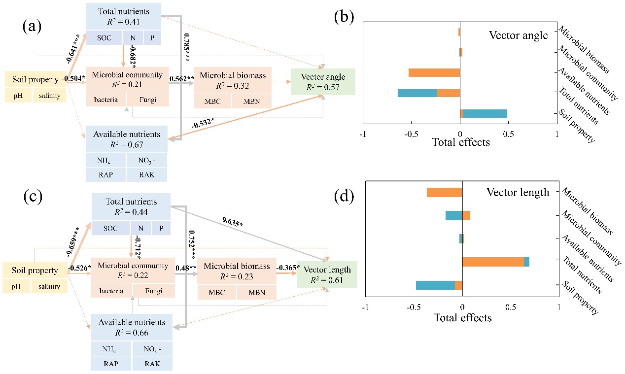 华南植物园鲁显楷研究员团队在Land Degradation & Development期刊发表最新研究成果,首次从微生物代谢养分限制的视角揭示了岛礁生态系统恢复中植被种植模式的优化策略,为生态工程实践提供了科学依据。在生态系统演替初期,因土壤养分贫乏,宜优先采用单一物种种植模式以快速形成基础生产力;待养分积累达到微生物代谢需求阈值后,逐步引入混交模式,通过物种互补效应提升生态系统生物多样性及稳定性。土壤微生物在陆地系统养分循环中扮演着关键调控作用。微生物代谢限制特征反映了其资源需求与营养物质供给之间的平衡,对环境变化响应敏感。热带岛礁生态系统通常具有高盐、高碱、贫瘠、持水能力差等特点,这些严重阻碍了支撑植被生长的微生物学过程,导致植被恢复面临严峻挑战。因此,如何选择适宜的恢复模式已成为亟需解决的科学问题。该研究针对热带珊瑚岛脆弱生态系统,聚焦在微生物养分代谢限制,探讨其对不同植被恢复模式的响应机制。该研究依托长期观测样地,分析了不同植被恢复模式下(无植被、单一种植和混合种植)的土壤酶化学计量特征,并运用酶化学计量和矢量模型解析了土壤微生物代谢限制状况。研究发现,热带珊瑚岛土壤养分是调控微生物代谢限制的主导因素,微生物代谢主要受碳(C)和氮(N)可利用性的强烈限制,而磷(P)并非限制因子。尤为关键的发现是,单一种植模式(如抗风桐,Pisonia grandis)比混合种植模式更能适应养分限制的岛礁环境。基于研究结果,研究团队提出在恢复初期应优先采用以抗风桐等为代表的单一种植模式,以快速建立先锋植被并有效改善土壤养分状况;待土壤养分积累至一定阈值后,再逐步过渡到混合物种策略,以提升生物多样性与生态系统服务功能。该研究从微生物角度回答了热带珊瑚岛生态系统恢复如何选择植被种植模式的问题,为我国海岛生态系统恢复与实践提供了有力的科学依据。相关成果以“Effects of different ecological restoration paradigms on soil microbial metabolic limitation in a tropical coral island”在线发表于国际知名刊物Land Degradation & Development(《《土地退化与发展》》)。中国科学院华南植物园博士生魏文涛为论文第一作者,已出站博后何小香为共同第一作者,鲁显楷研究员为通讯作者。华南植物园任海、闫俊华、叶清、王法明研究员等参与了该研究。研究得到国家重点研发计划项目等资助。文章链接: https://doi.org/10.1002/ldr.70258图1. 热带珊瑚岛不同植物种植模式下土壤酶活性图2. 热带珊瑚岛不同植物种植模式下酶矢量特征图3. 土壤性质、土壤养分以及微生物性质对微生物养分限制的主要影响途径