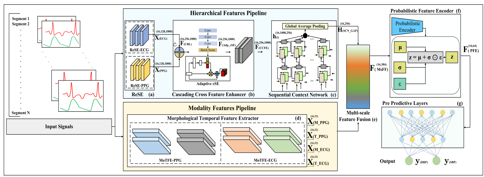 血压是反映心血管功能和血管阻力的关键生理参数,也是评估整体心血管疾病风险的核心指标。它与代谢健康状况密切相关,是代谢综合征的诊断标准之一。在针对高血压或代谢综合征患者进行营养干预时,血压的动态监测是评估干预效果和进行个体化饮食调整的重要依据。无袖带血压监测技术具有连续、非侵入性等优点,为实现血压的动态监测提供了新手段,其临床与公共卫生意义日益凸显。然而,现有技术仍受限于信号处理复杂、特征表达不足以及准确度较低等关键瓶颈,致使其在真实场景中的规模化应用仍面临严峻挑战。血压是反映心血管功能和血管阻力的关键生理参数,也是评估整体心血管疾病风险的核心指标。它与代谢健康状况密切相关,是代谢综合征的诊断标准之一。在针对高血压或代谢综合征患者进行营养干预时,血压的动态监测是评估干预效果和进行个体化饮食调整的重要依据。无袖带血压监测技术具有连续、非侵入性等优点,为实现血压的动态监测提供了新手段,其临床与公共卫生意义日益凸显。然而,现有技术仍受限于信号处理复杂、特征表达不足以及准确度较低等关键瓶颈,致使其在真实场景中的规模化应用仍面临严峻挑战。2025年10月,中国科学院深圳先进技术研究院(简称“深圳先进院”)聂泽东研究员团队在 IEEE Journal of Biomedical and Health Informatics(JBHI)发表了基于ECG与PPG的动态血压监测研究 “MuFuBP-Net: A Multimodal Fusion Network for Cuffless Blood Pressure Estimation Using Dual-Feature Pipeline With Probabilistic Feature Encoder”(Highlights文章),并以配图形式登载于 JBHI October 2025当期封面。在研究中,团队提出了一种全新的多模态融合网络模型MuFuBP-Net,用于基于 ECG 与 PPG 的无袖带血压估计。模型采用双特征提取通道架构,分别进行分层与模态特征建模;引入 Cascading Cross-Feature Enhancer(CCFE) 跨模态融合与通道注意机制,动态调节时空特征的重要性;基于变分思想设计 Probabilistic Feature Encoder(PFE),对高维融合特征进行紧凑建模与去冗,从而提升泛化能力与鲁棒性。在 MIMIC-II 与 MIMIC-III 数据库上,所提出的模型在收缩压(SBP)评估中达到MAE ± SDE ≤ 2.99 ± 4.37 mmHg,舒张压(DBP)评估中达到MAE ± SDE ≤ 2.63 ± 4.19 mmHg ,结果优于国内外同类模型,并符合 AAMI、BHS、IEEE 三大国际标准的 A 级要求。研究同时引入 LIME 可解释性分析,验证 ECG 在血压预测中的关键作用,并通过多组消融实验进一步确证模型设计的有效性与创新性。该研究为便携式、无袖带血压监测系统提供了扎实的理论与方法支撑,适用于家庭健康监测、慢病管理、精准营养干预以及资源受限地区等场景。中国科学院深圳先进技术研究院聂泽东研究员为论文唯一通讯作者。其博士研究生法哈德·哈桑(Farhad Hassan)为论文第一作者。本研究获得国家重点研发计划、中国科学院医学成像科学与技术系统重点实验室联合资助。图1 文章封面,原文链接:https://ieeexplore.ieee.org/document/10975118/图2 JBHI Highlights 文章图3 MuFuBP-NET 算法模型图4 结果验证与对比<!--!doctype-->