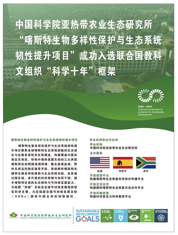 11月28日,中国科学院亚热带农业生态研究所陈洪松研究员牵头组织申报的“喀斯特生物多样性保护与生态系统韧性提升项目”(Karst Biodiversity Conservation and Ecosystem Resilience Enhancement Programme,简称喀斯特生物多样性)成功入选联合国教科文组织(UNESCO)2024–2033年科学促进可持续发展科学十年(International Decade of Sciences for Sustainable Development ,IDSSD)实施倡议。