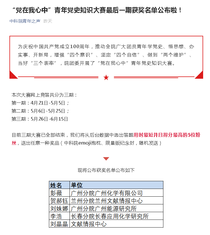 6月15日,中科院团委公布了“党在我心中”青年党史知识大赛第三期(5月26日-6月15日)获奖名单,中科院广州化学有限公司(广州化学)团员彭薇在比赛中脱颖而出,凭借答题用时最短并且得分最高取得优异成绩。