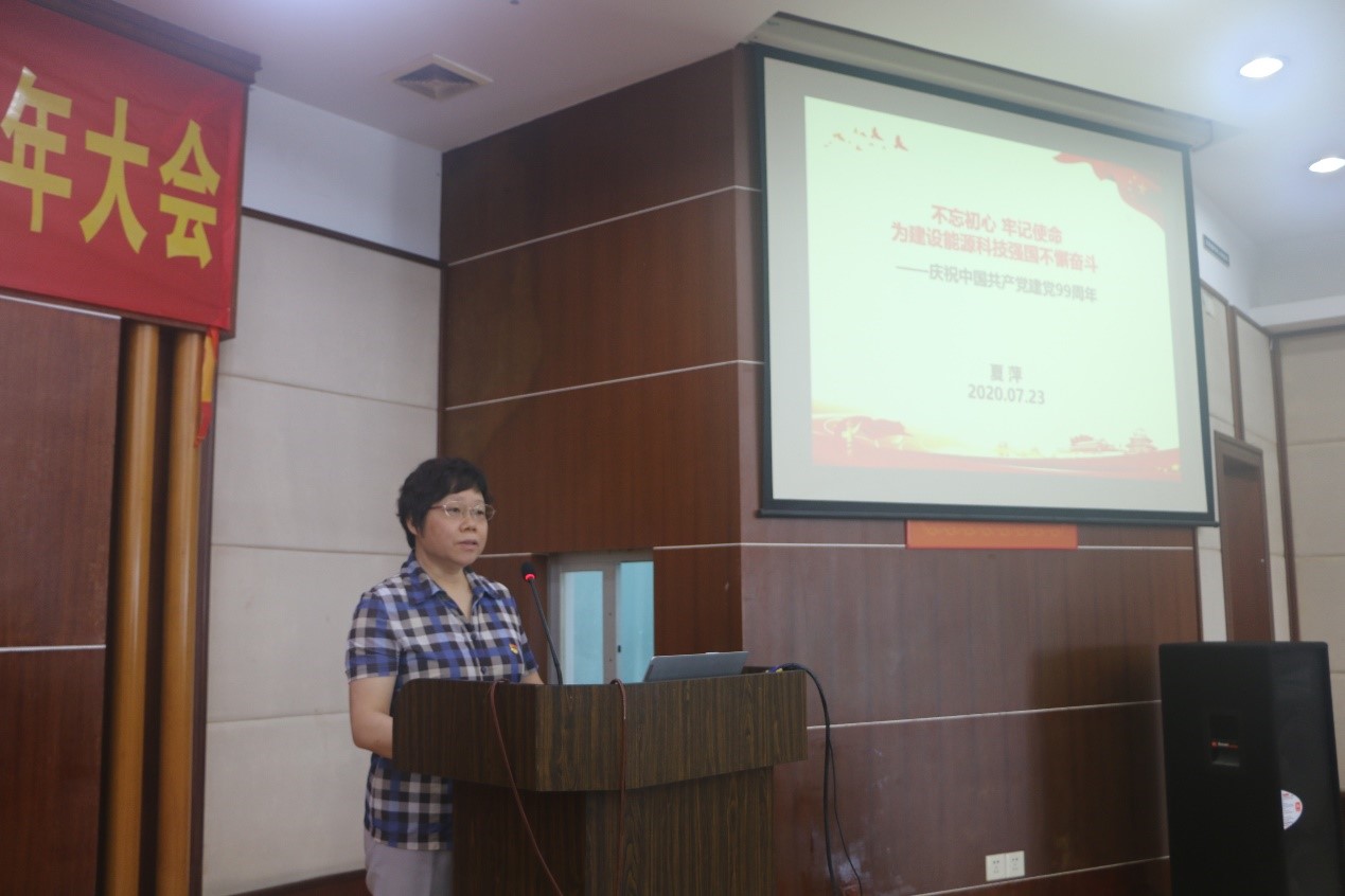 大会在庄严的国歌声中拉开序幕。党委书记、副所长夏萍首先以《不忘初心 牢记使命,为建设能源科技强国不懈奋斗》为题,作专题党课报告。夏萍带领大家重温了中国共产党99年以来走过的峥嵘岁月和光辉历程,号召全体党员追悟初心,牢记使命担当。报告重点围绕国家战略科技力量的使命和责任,结合研究所工作实际,对职工党员如何为建设能源科技强国作出贡献提出了具体要求。夏萍强调,全所党员、职工要继承和发扬中科院优良传统,大力弘扬科学家精神,发扬我国科技工作者在抗击疫情中所表现的创新进取精神,以更坚定的信心、更强的干劲、更大的勇气,为实现“三个面向”“四个率先”目标要求、为建设世界科技强国作出更大贡献。