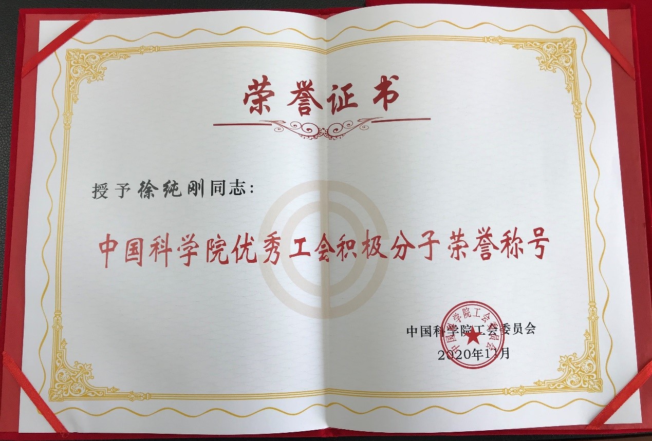 徐纯刚作为工会副主席,对工会工作始终充满热情。多年来为营造研究所积极向上、健康乐观的工作学习氛围,徐纯刚利用自己在文体方面的特长,积极组织各类文体活动,包括组织每年一度的新春联欢会等大型汇演和建所四十周年联欢晚会;在他的组织下,研究所成立了所羽毛球协会、足球协会、乒乓球协会等运动协会;所内职工在他的热情号召下积极参加田径比赛、趣味运动会、篮球比赛、乒乓球比赛、广播体操比赛等活动。徐纯刚在日常工作生活中处处关心职工、学生,积极倾听他们的诉求、维护他们的权益,真正做到了爱岗敬业、无愧科研人、不枉工会人。徐纯刚同时也是一位优秀的科技工作者,作为天然气水合物开采技术与综合利用研究室科研骨干,在科研工作上兢兢业业,曾获2019年度广东省自然科学奖一等奖,自2012年至今共发表SCI/Ei论文136篇(第一和通讯作者31篇),获得授权发明专利16件(PCT专利4件,美国专利2件)。