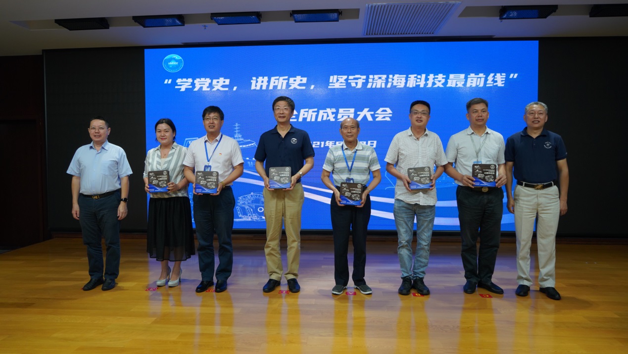 升旗仪式结束后,在学术报告厅组织召开“学党史,讲所史,坚守深海科技最前线”全所党员大会。党委委员、副所长彭晓彤主持会议。会上,集中观看深海所十周年历程视频,党委副书记(主持工作)、副所长阳宁和副所长许惠平为2011年入所的职工颁发了入所十周年章。随后,原筹建组组长王越超、副组长戴琼兴分别回顾了深海所筹建期的故事;周义明、唐古拉山、邓玉清、蒋磊、周皓分别结合自身工作,分享在所工作的经历和感受。