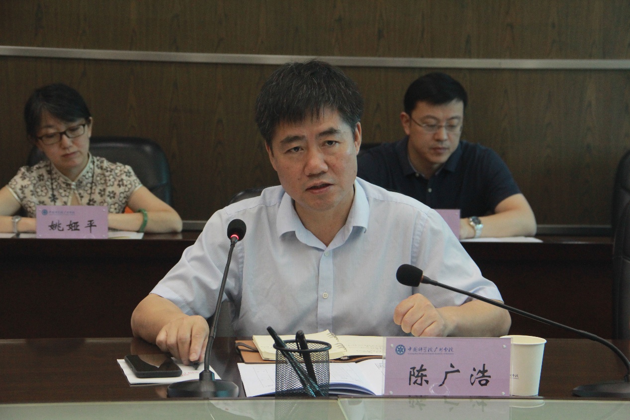 广州分院分党组书记陈广浩代表广州分院对各位与会人员的到来表示欢迎,并简要介绍了目前广州分院的概况及参与粤港澳大湾区建设共建广州南沙科学城、中科院明珠科学园的情况。