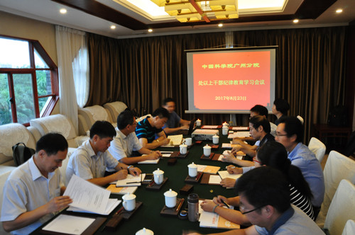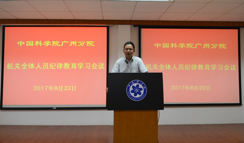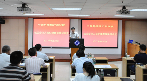 8月22~23日,中国科学院广州分院机关党委、机关纪委按照《中共广东省委办公厅转发〈省纪委关于2017年我省开展纪律教育学习月活动的意见〉的通知》要求和中科院广州分院分党组制定的实施方案,组织分院机关全体在职人员开展纪律教育学习月专题学习活动。广州分院分党组副书记、机关党委书记周传忠主持专题学习活动。